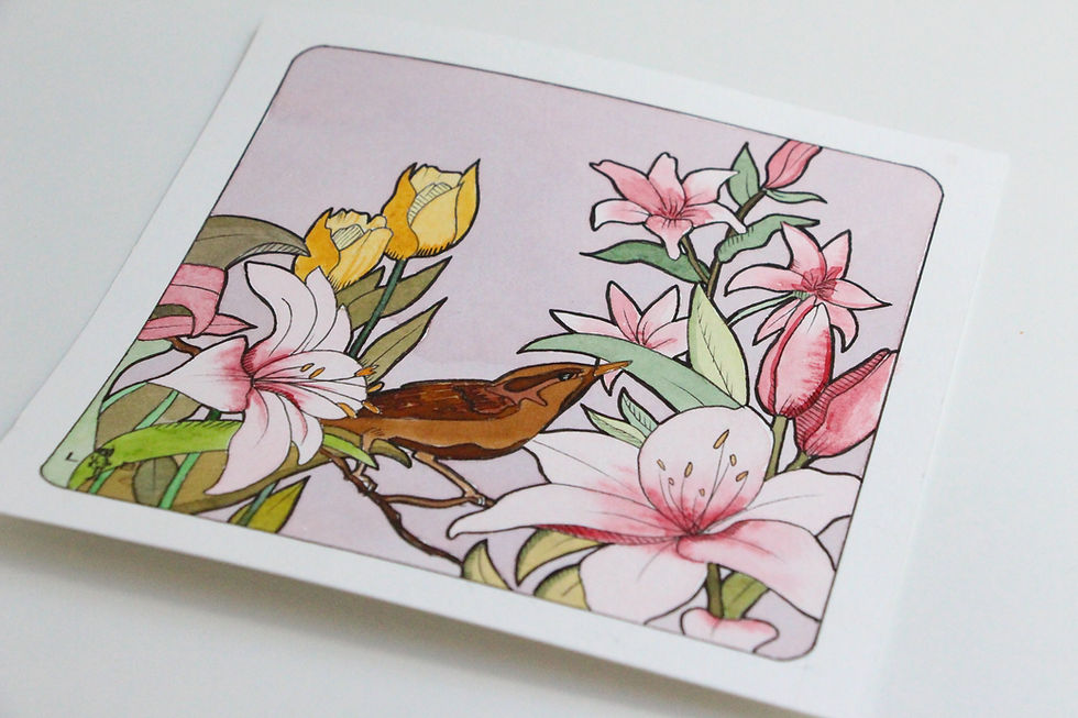 "Moineau et lys" aquarelle originale de Lucile Béranger